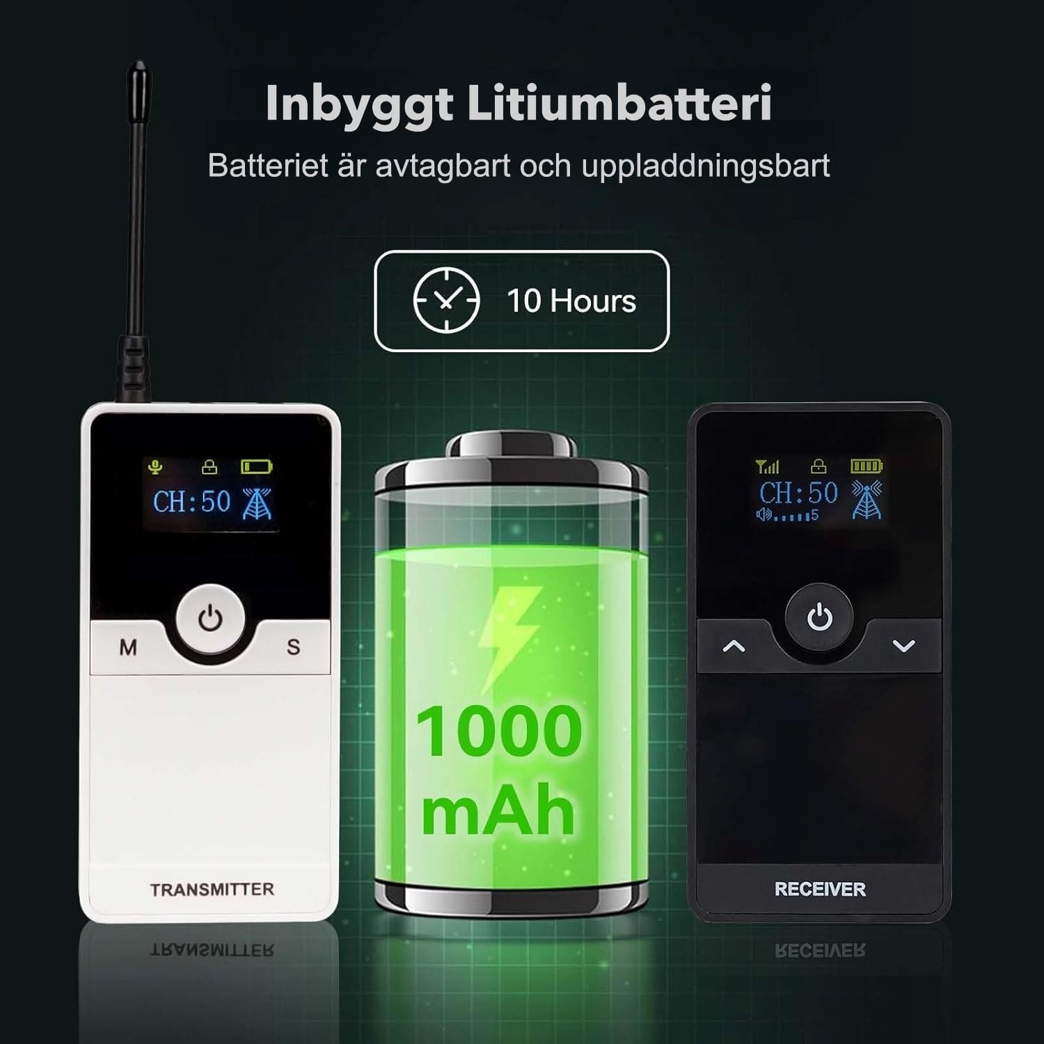 Hyr ett komplett guidesystem och betala per månad. Systemet består av 2 sändare med huvudmikrofon för guide och 28 mottagare med hörlurar för deltagare tillsammans med en laddväska. Serviceavtal ingår.