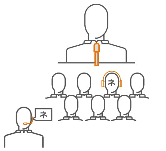 - Helt trådlösa mottagare med inbyggd hörlur eller fickmottagare med separat hörlurar för deltagaren. Varje språk har sin egen kanal.