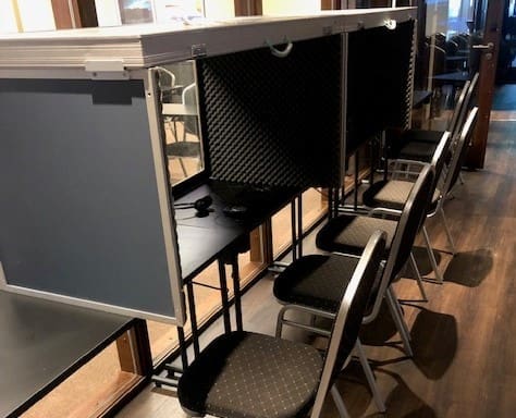Bärbara tolkbås för bord med plats för en eller två tolkar. Optimal för enkel transport och snabb montering.