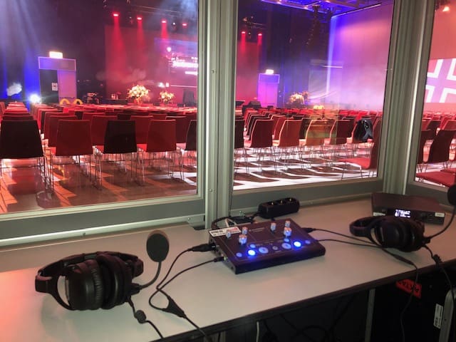 - Ljudkontrollcenter med mikrofon och hörlurar eller headset med för tolken. Detta möjliggör att en eller två tolkar kan övervaka ett golv och aktivera mikrofoningångar.